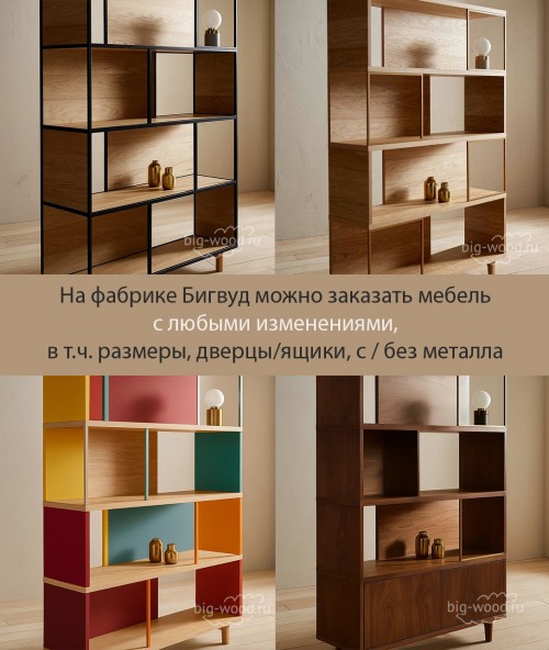 Благодаря расширению наших производственных мощностей на фабрике Big-Wood теперь можно заказывать мебель и книжные шкафы с недорогой основой из ЛДСП различных цветов, а фасады сделать более дорогими и презентабельными - со шпоном или из цельного массива. Это особенно актуально для больших проектов.